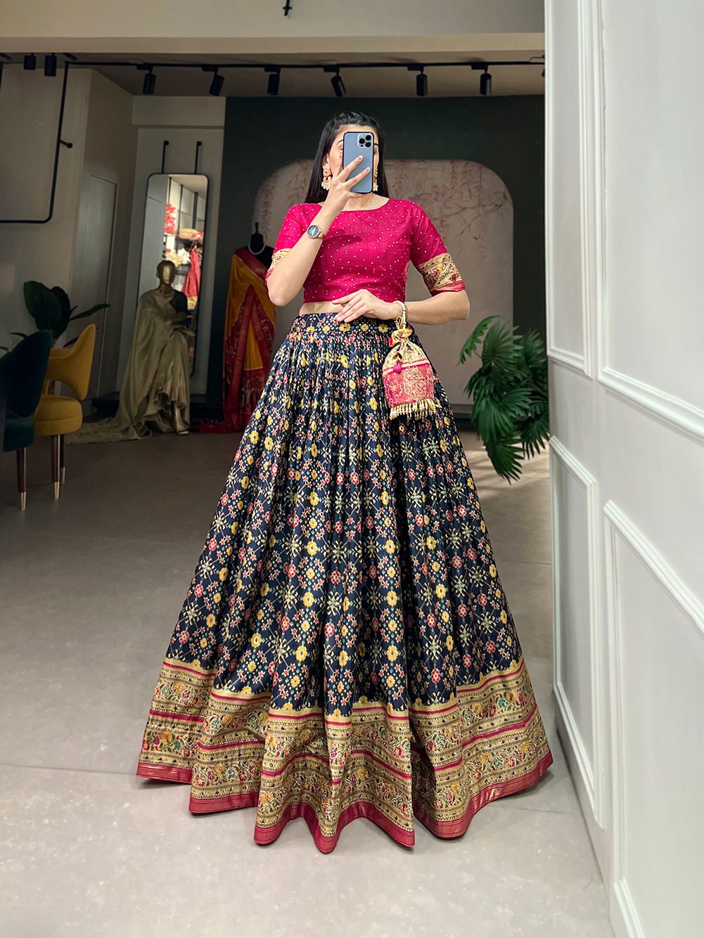 Make a statement in this exquisite co-ord set lehenga crafted from ikkat patola, where every thread tells a story of tradition and beauty.