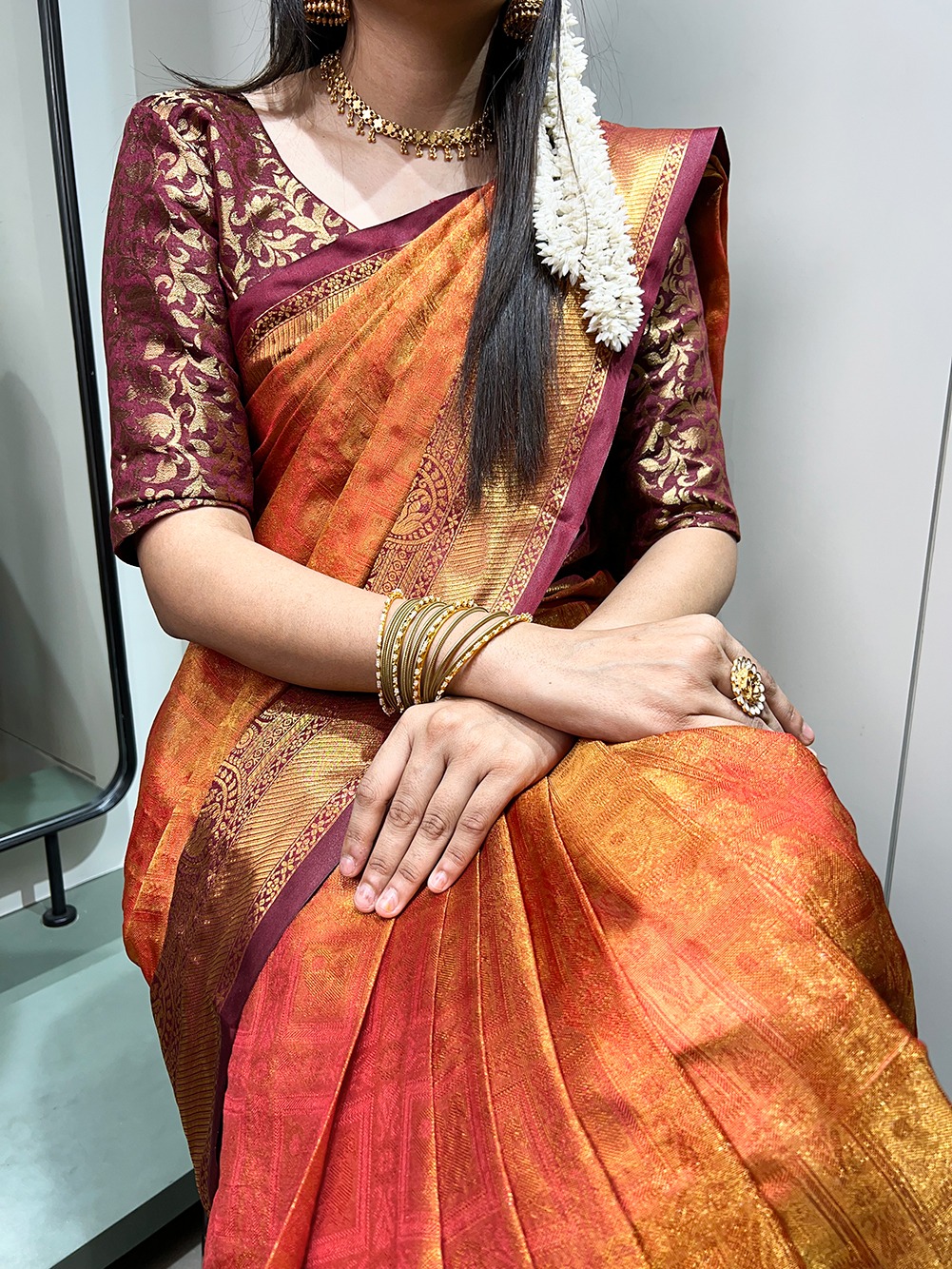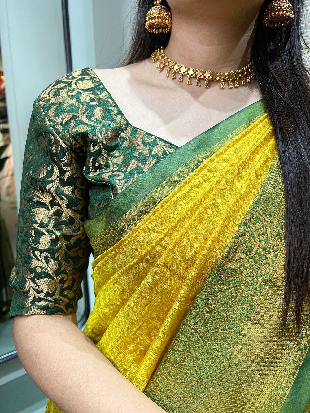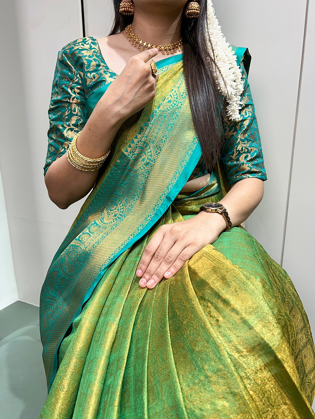 Kanjivaram saree embodies the epitome of timeless beauty and cultural heritage. with intricate motifs and vibrant hues, she exudes grace and elegance, reflecting the rich traditions of her land💚.