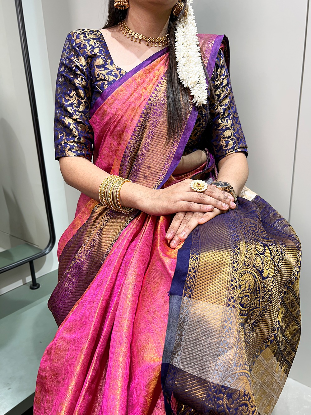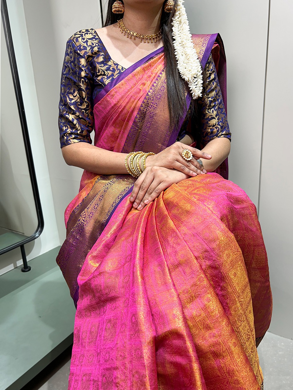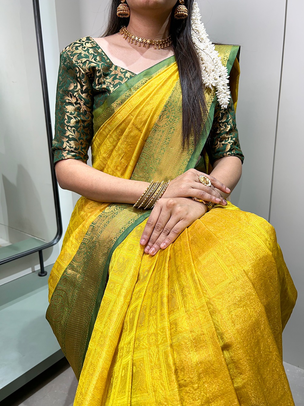 Kanjivaram saree embodies the epitome of timeless beauty and cultural heritage. with intricate motifs and vibrant hues, she exudes grace and elegance, reflecting the rich traditions of her land💚.